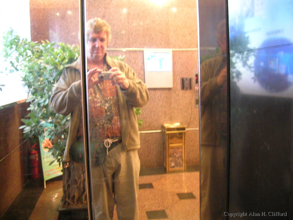 Alan reflected in the lift doors at eg Chongwenmen Hotel dscn0526 |